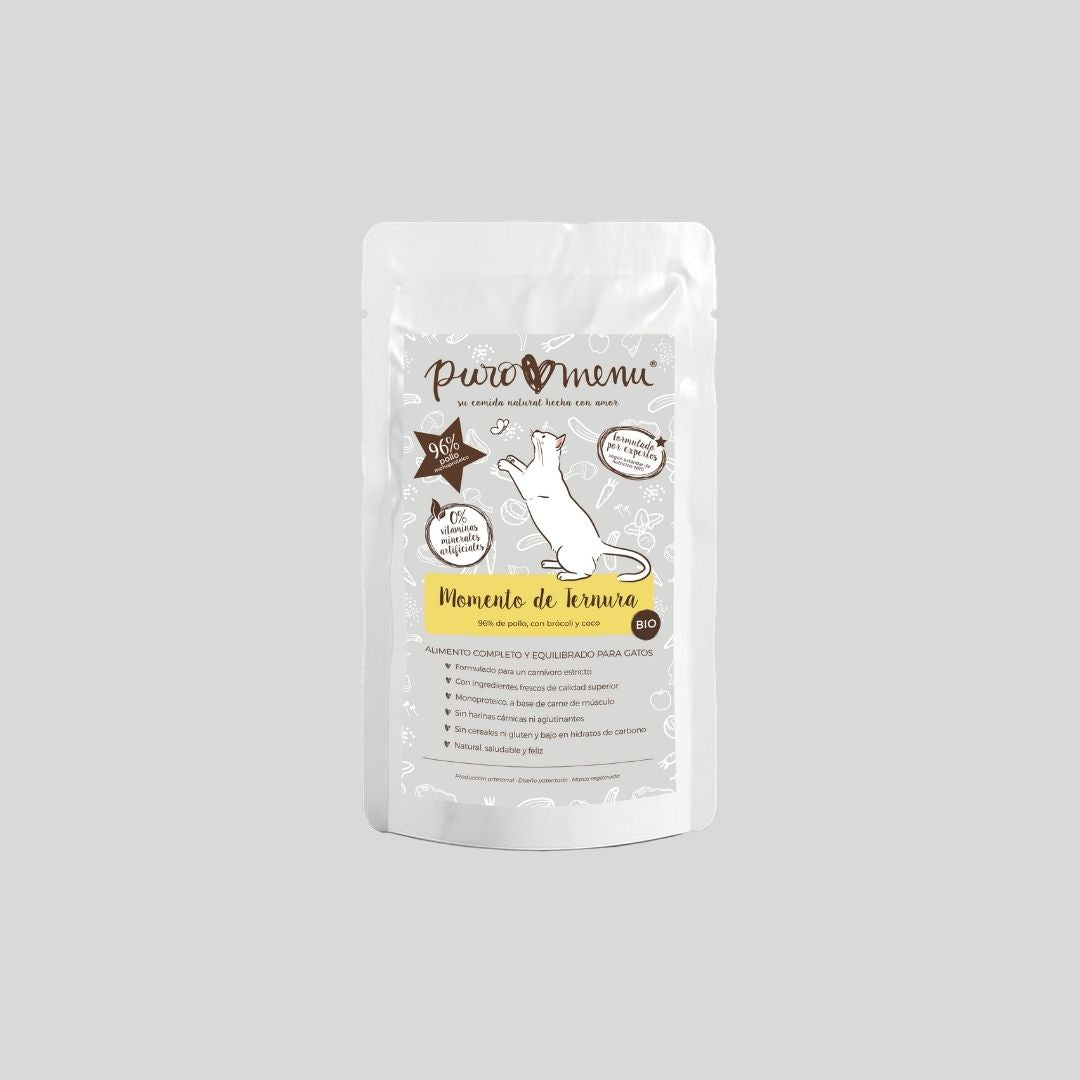 Nuestra comida cocinada natural BIO para gatos es una opción práctica, nutritiva y segura para alimentar bien a tu gato en cualquier momento. Elaborada con ingredientes de origen ecológico, sin cereales ni aditivos artificiales, y cocinada suavemente para respetar su sistema digestivo.